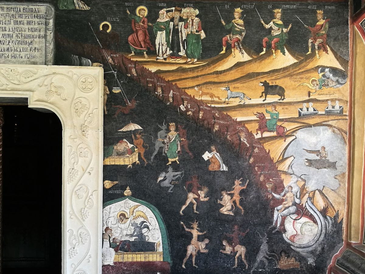 Așa a încheiat părintele Valentin Bădescu predica la Biserica Kretzulescu. Și mi-am amintit de pereții pictați din Biserica Bolniței, nu cea principală, biserica veche, mică și tihnită, a Mănăstirii Polovragi. Cu sfinți și diavoli și părinți. O mănăstire veche de peste 500 de ani, ridicată la ieșirea Oltețului dintre Parâng și Munții Căpățânii.