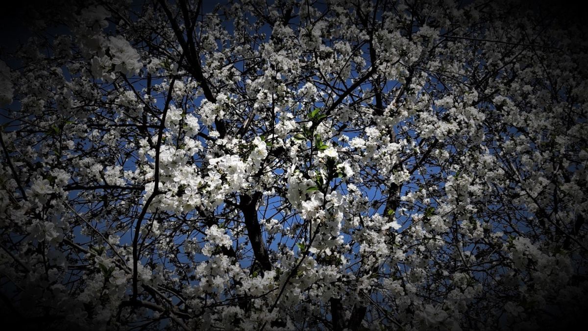 Toți pomii sunt înfloriți.